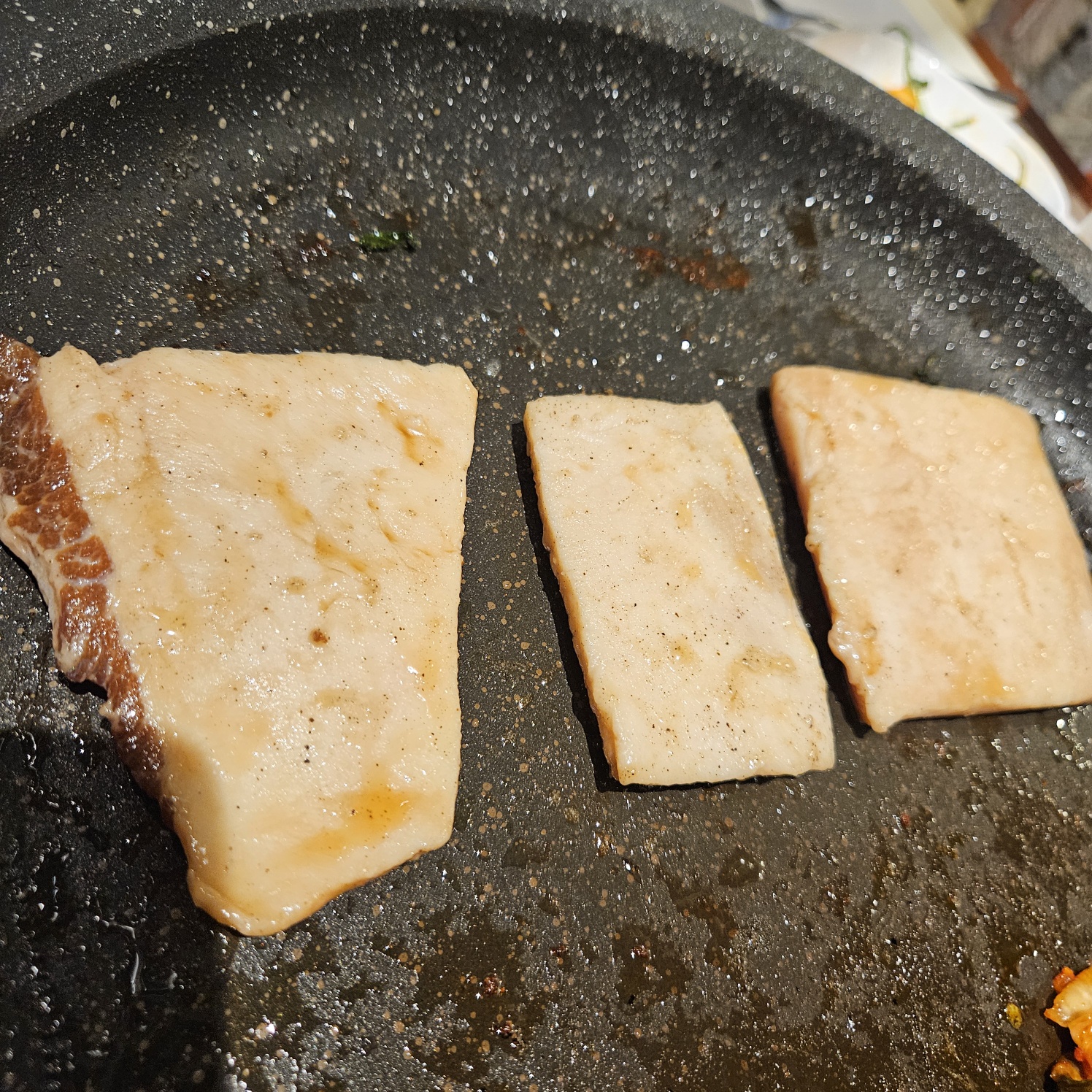 삼겹살을 다 먹고 입이 심심해서 술이랑 같이 먹으려고 시킨 껍데기. 평소에 먹었던 껍데기보다는 말랑말랑해서 취향을 좀 탈 거 같다. 내 입맛에는 안 맞았던 걸로..